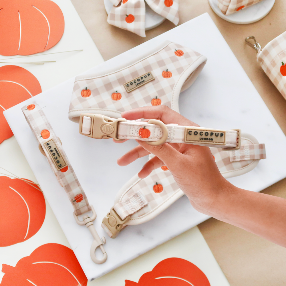 The Pumpkin Patch Collar brings a playful autumn vibe with its cute nude gingham design and embroidered pumpkins. Perfect for crisp fall dog walks, it features a safety lock on the buckle to keep your furry friend secure and stylish.