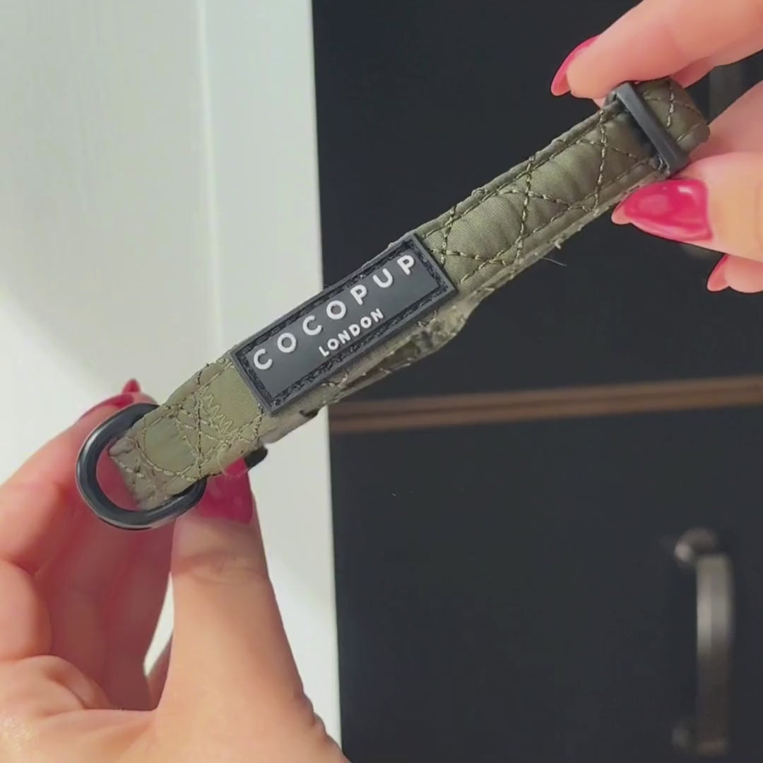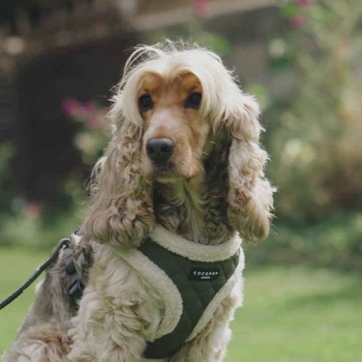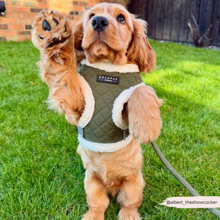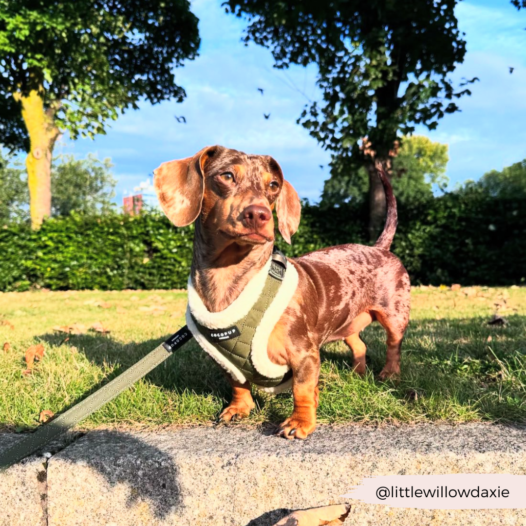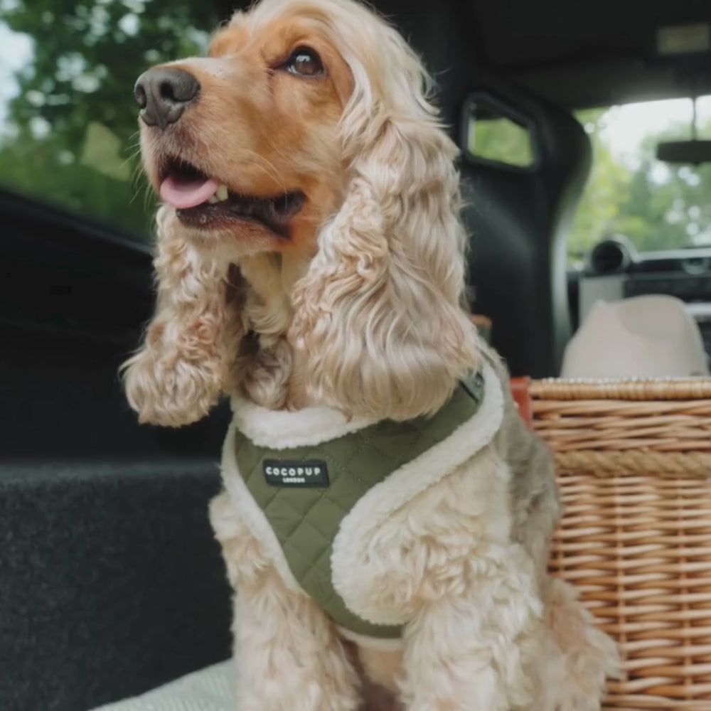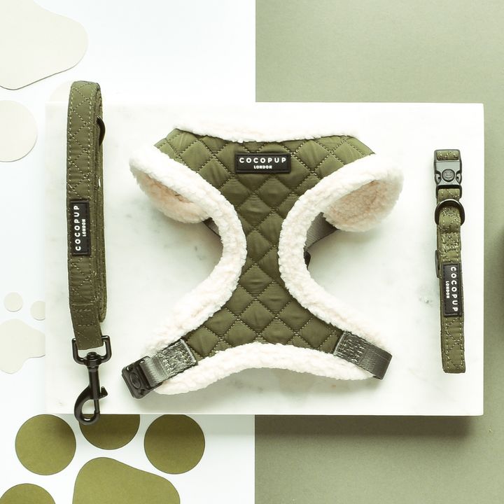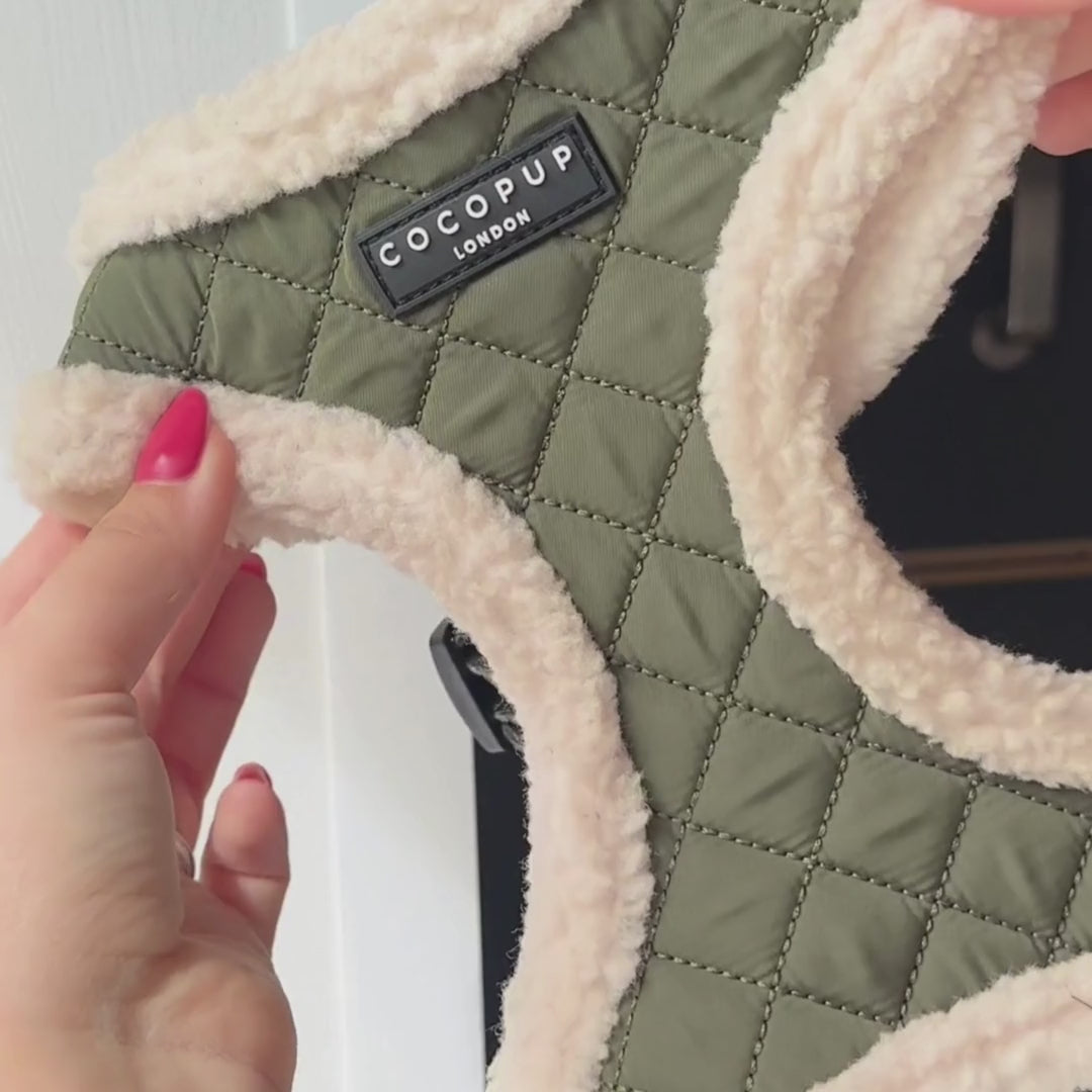 Olive quilted dog harness with white fleece lining from COCO PUP London.