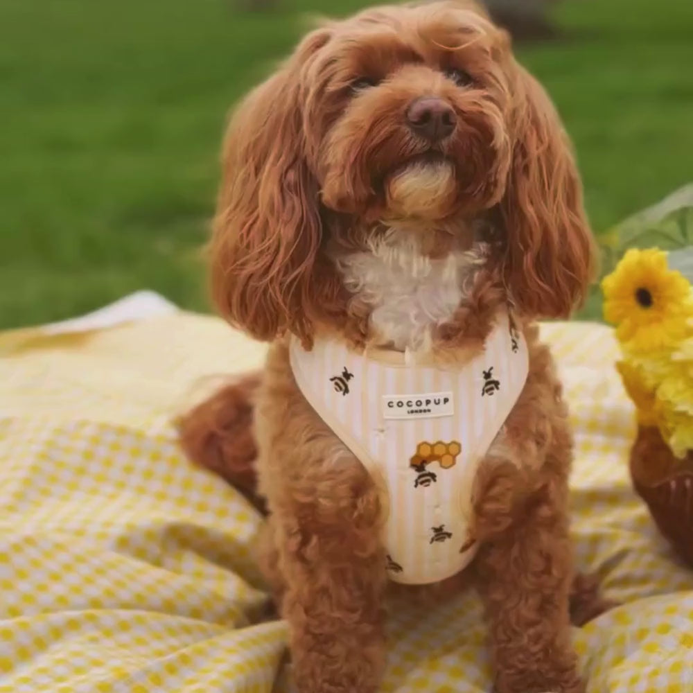 Make every countryside adventure memorable with Honey Meadow! Featuring trending bright butter yellow and white stripes embroidered with delightful honey pots, bees, and wildflowers. This Adjustable Neck Harness, Collar and Lead trio dog walk kit will have your pup looking absolutely adorable during country walks or woodland trails.