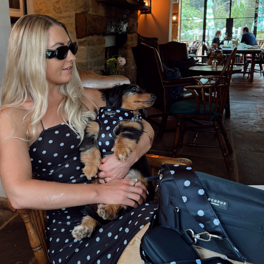 Our Bag Bundle includes: Black Bag, Treat Pouch & Satin Polka Dot Strap (with inbuilt poop bag dispenser!)