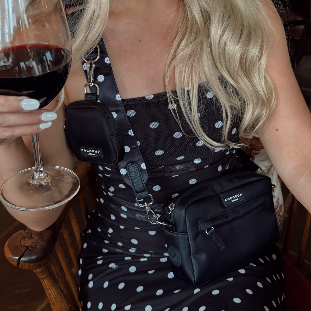 Step out in style with our Dog Walking Black Bag Bundle, featuring a chic satin polka dot strap that's totally on trend. Say goodbye to chaotic poop bags and squished treats in your pockets... and say hello to our all encompassing Dog Walking Bag, Treat Pouch & Strap! The perfect solution to your Dog Walking needs, featuring a side poop bag dispenser and a treat pouch.