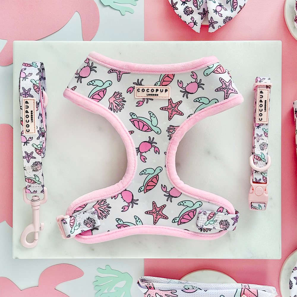 Pawsitively perfect for a beach day with your furry friend! This Pawcific Pink Reef bundle includes an adjustable neck harness, lead, and collar featuring a fun pink design with turtles, starfish, and crabs. Keep your pup safe with the safety lock on both the harness and collar buckle. Let's go for a dog walk, summer style!