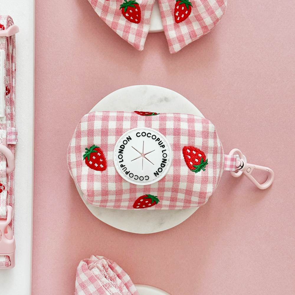 Keep your dog walks berry cute with our Strawberry Picnic Pup Poop Bag Holder! Featuring a charming pink and white gingham pattern and adorable embroidered strawberries, this summer essential is both practical and stylish. A must-have for any dog owner.